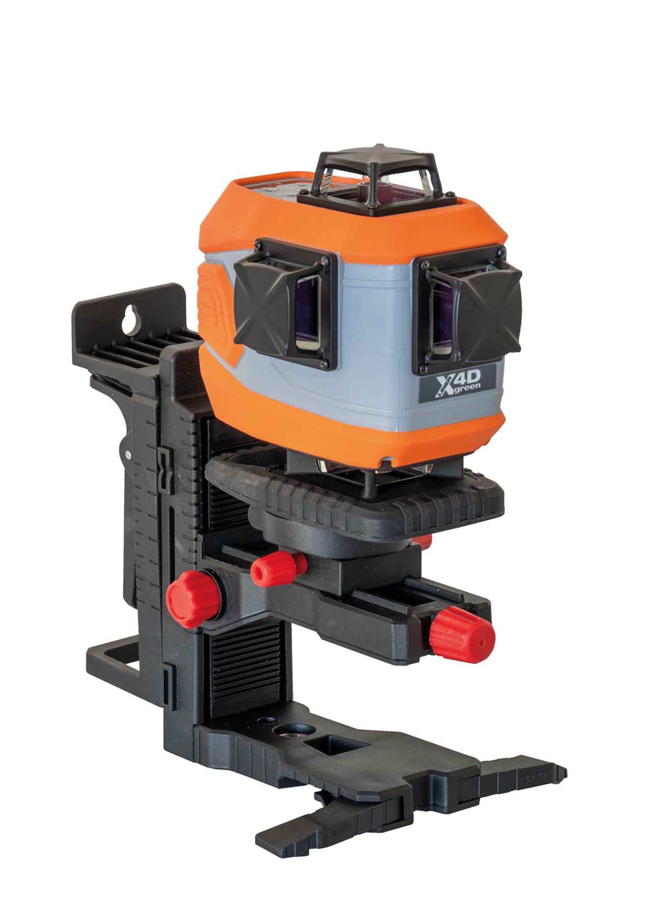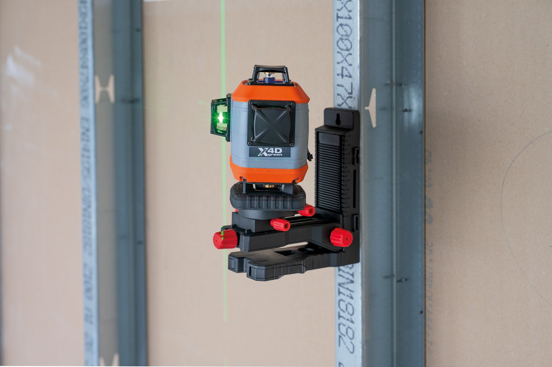 Для всіх інших завдань нівелювання доступна горизонтальна лазерна лінія на 360°, що виходить згори корпусу. Дві вертикальні, точно перпендикулярні лазерні лінії на 360° використовуються для вирівнювання, перенесення прямих кутів та слюсарних робіт. Зелені лазерні лінії особливо помітні та забезпечують робочий діапазон до 50 метрів без лазерного приймача. Лазерні лінії нівелюються автоматично за допомогою електронних датчиків та електричних серводвигунів. Це робить новий X-Liner 4D green надзвичайно надійним та міцним.