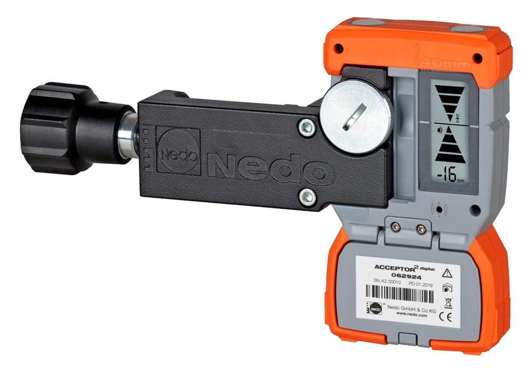Лазерний приймач NEDO ACCEPTOR 2 digital (арт. 430338) з міліметровим дисплеєм показує в цифровому вигляді розбіжність нульової лінії лазерного приймача від площини лазера ротаційного лазера. За допомогою дисплея в міліметрах різницю у висоті під час нівелювання можна зчитувати безпосередньо – без розрахунків.